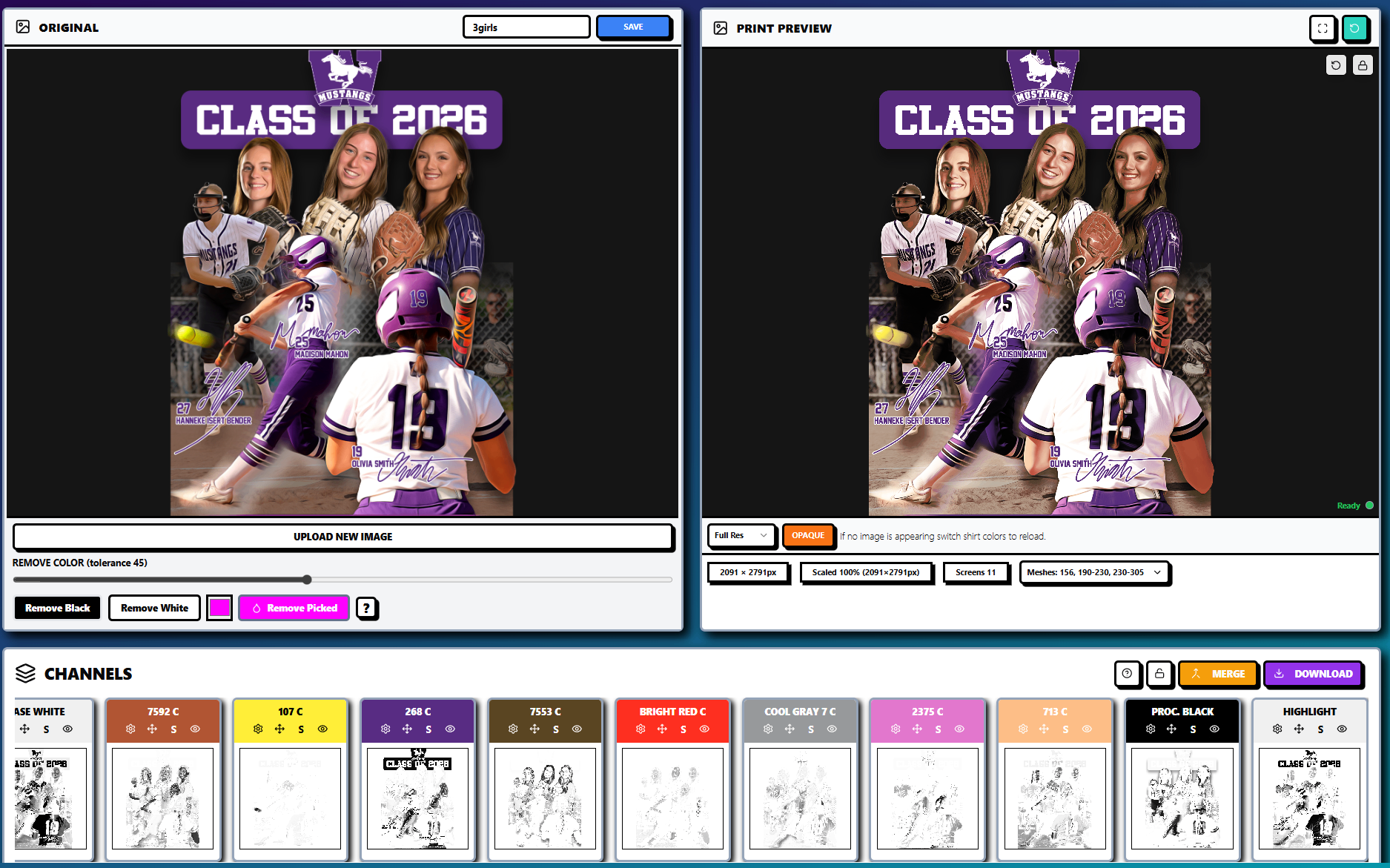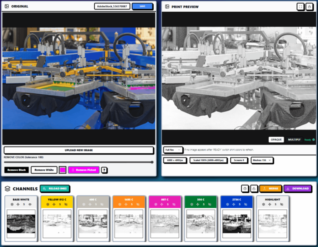 InkSplit removes these bottlenecks across the screen printing workflow with automated color separation and an integrated RIP: